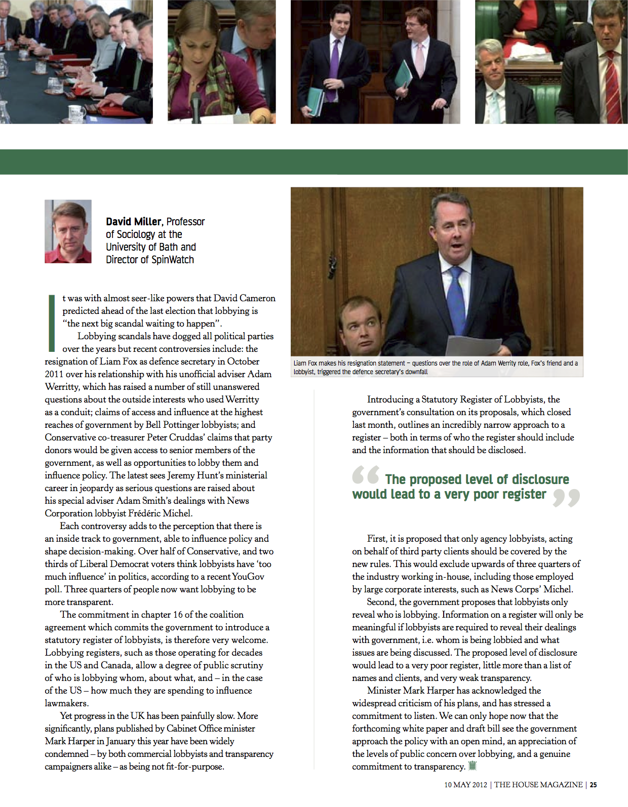 - Miller, D., 'Three experts review progress on the Coalition Agreement's commitments on lobbying' The House Magazine, No. 1416, Vol 36, 10 May 2012: p 25.